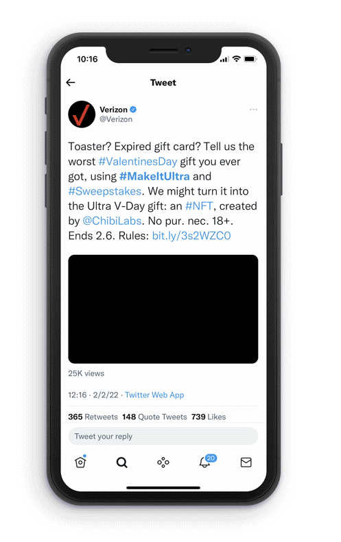 First, we posed a simple question on Twitter, “what’s the worst Valentine’s gift you ever got?”. The response was massive, and the NFT community was all in, tweeting Verizon their gifting horror stories. Then, we partnered with one of the hottest NFT collectives, Chibi Labs. Over Valentine’s Day weekend, Verizon and Chibi Labs got to work: designing, developing, and minting a collection of 20 NFTs based on the community's responses.